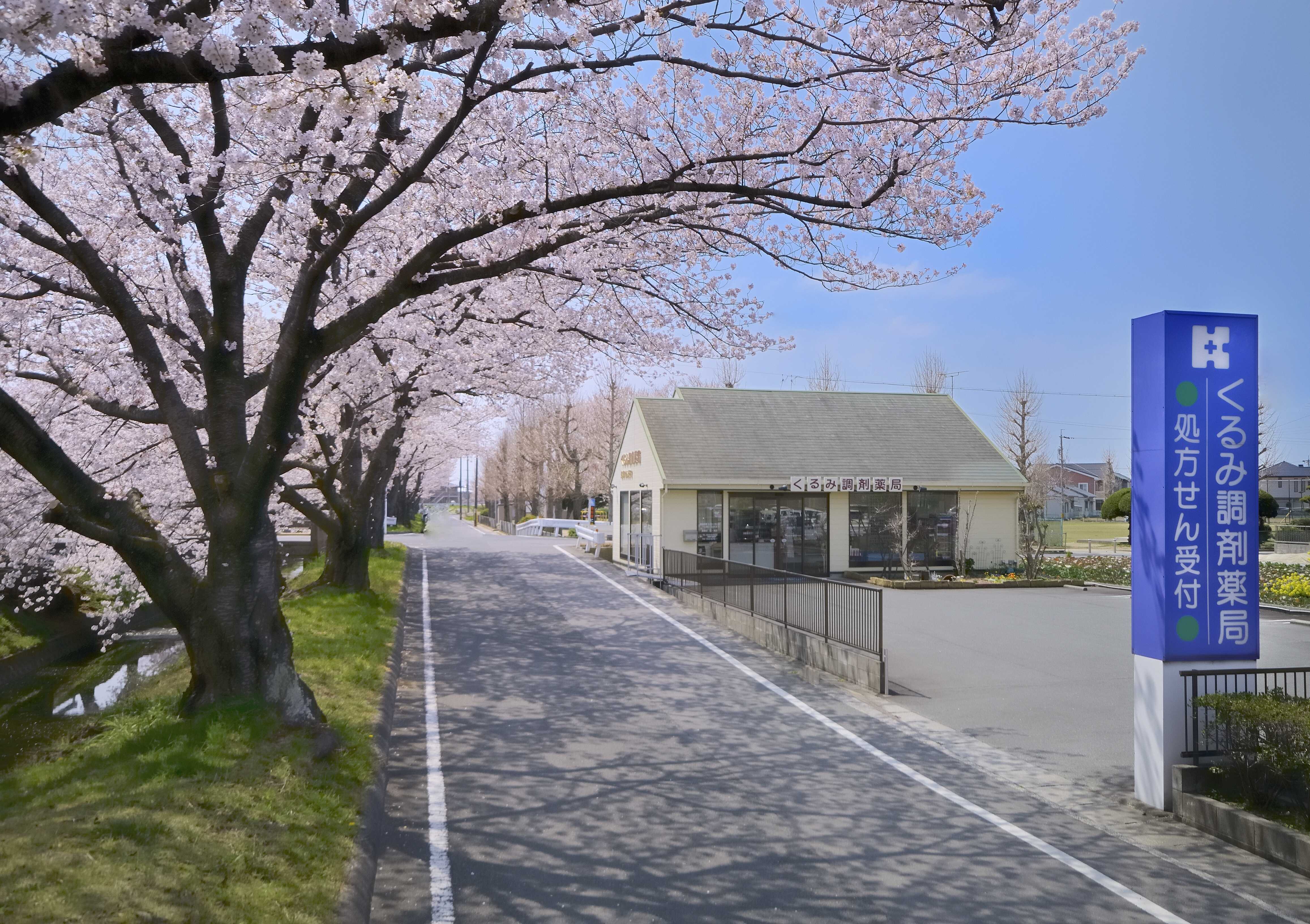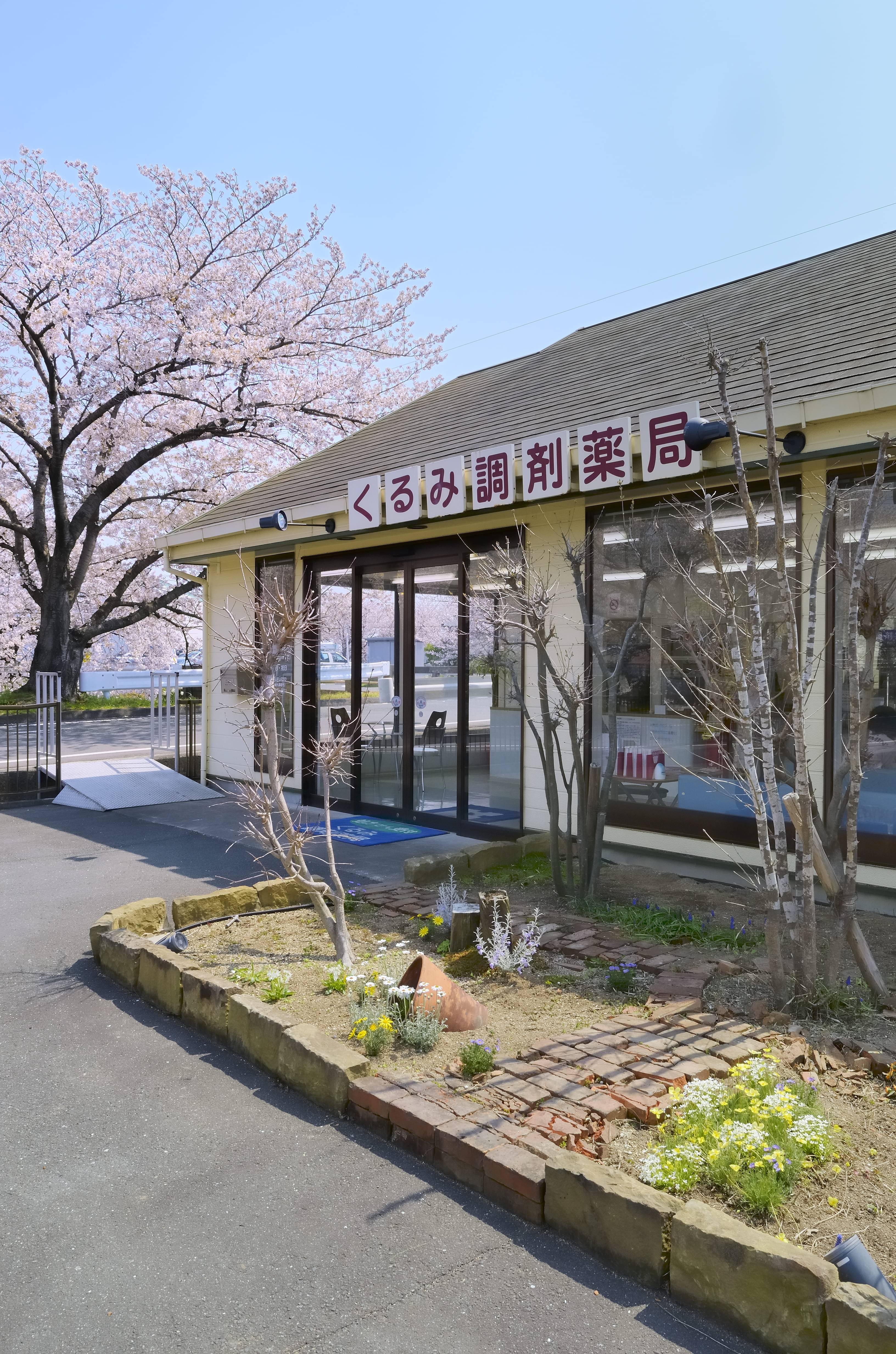敷地面積300平方メートル超。素焼きのレンガを並べた庭園には、スタッフたちが手入れをしているハーブなどの緑が植えられ、待合室の大きな窓から眺めることができます。春には桜並木が満開となるなど、季節の花々を楽しむこともできる薬局。自然の中で木のぬくもりを感じられる、まるで家のようにゆったりと過ごせる店舗です。