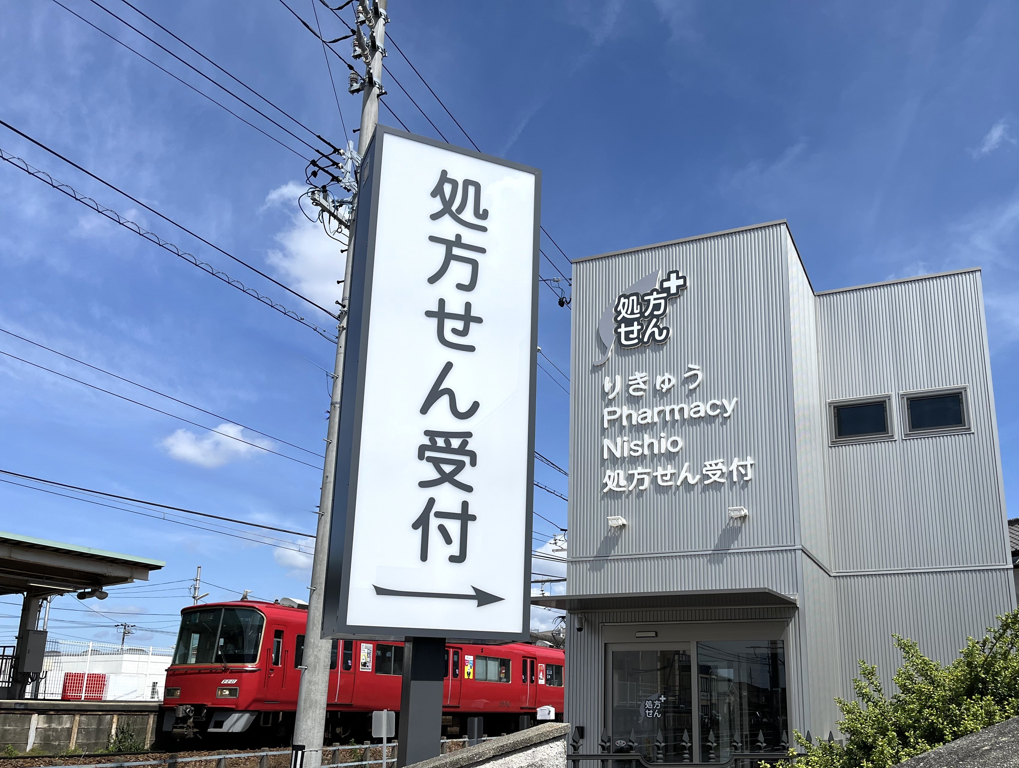 りきゅう Pharmacy Nishioは、名鉄西尾線桜町前駅から徒歩3分という交通アクセスの良い場所に位置し、桜町前駅のホームから目の前に見えて地域の皆様にも親しまれる店舗です。