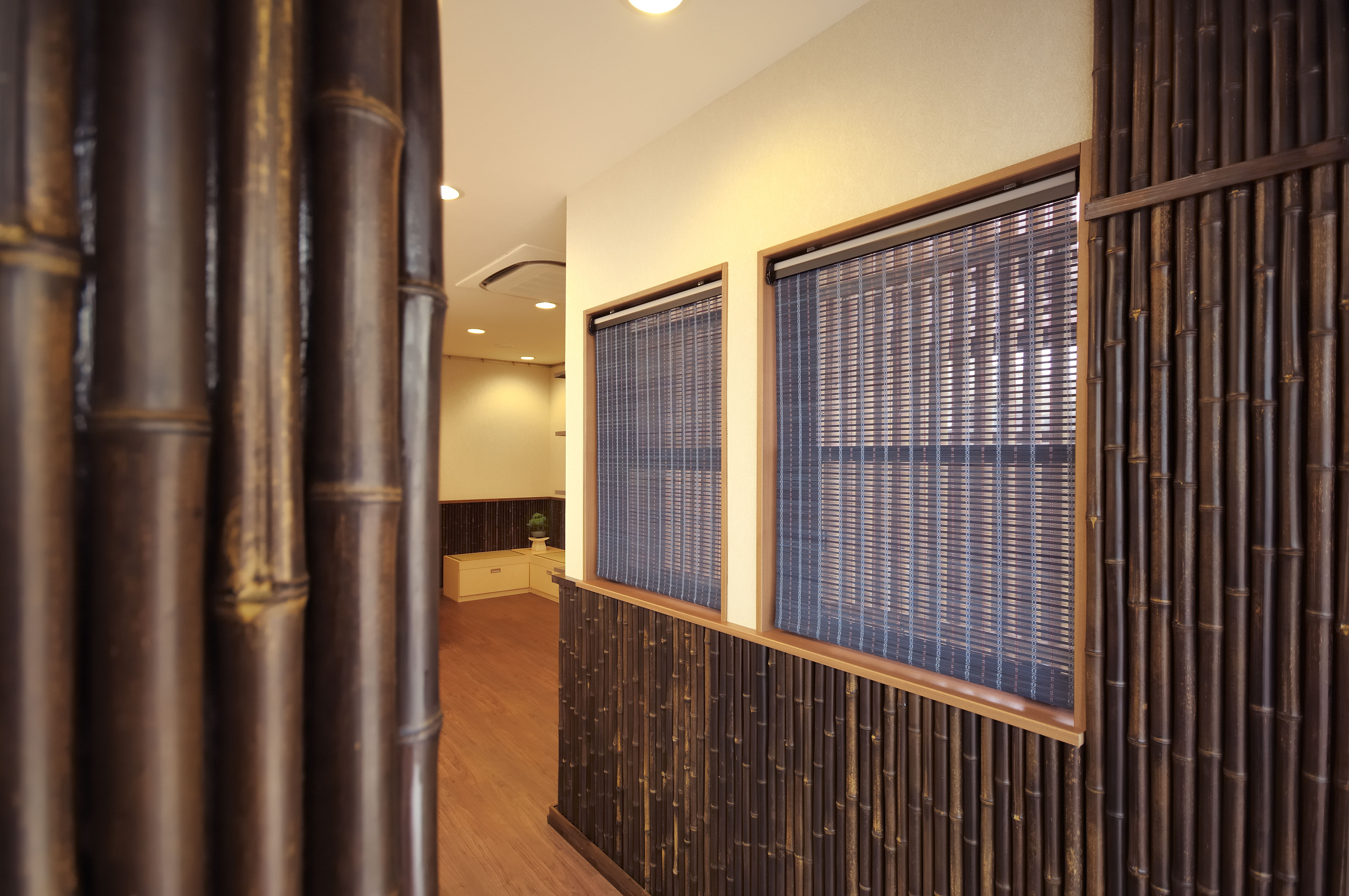 待合室の壁に黒竹をふんだんに使用し、畳の椅子を配置するなど、本格的な和モダンの店舗。患者さんに自由に絵や写真を飾っていただくことのできる市民ギャラリーも設けており、近隣の方々が気軽に訪れることのできる憩いの場所ともなっています。
